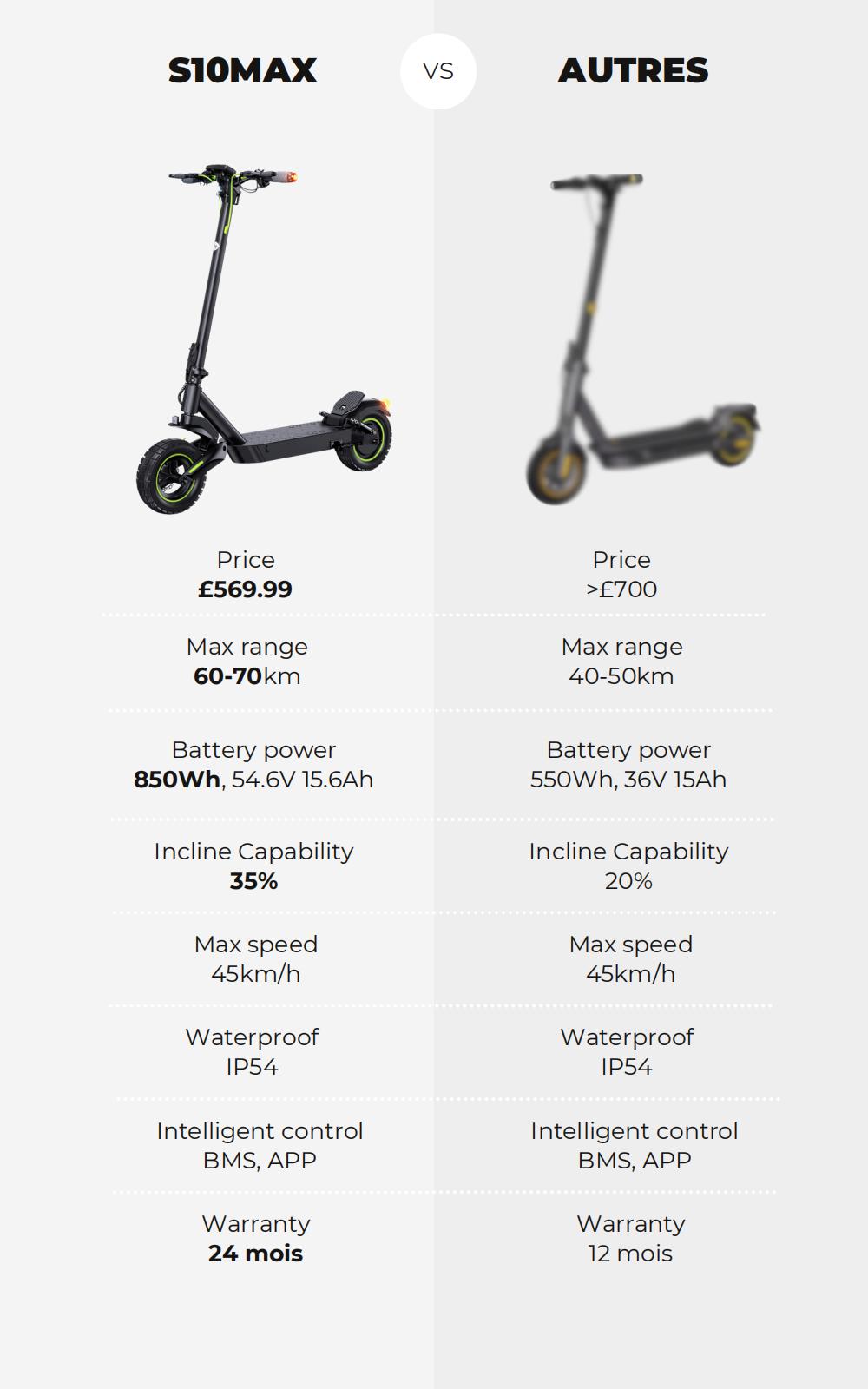 | Package Included | S10MAX Electric Scooter*1 T-type hexagonal wrench*1 Pole screw*6 (including 2 spare) Charger*1 Charging cable*1 User manual*1 Hang tag*1 Brand card*1 Inflatable inner tube*1 E-Scooter bag*1 |