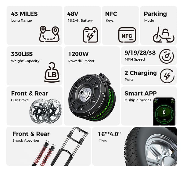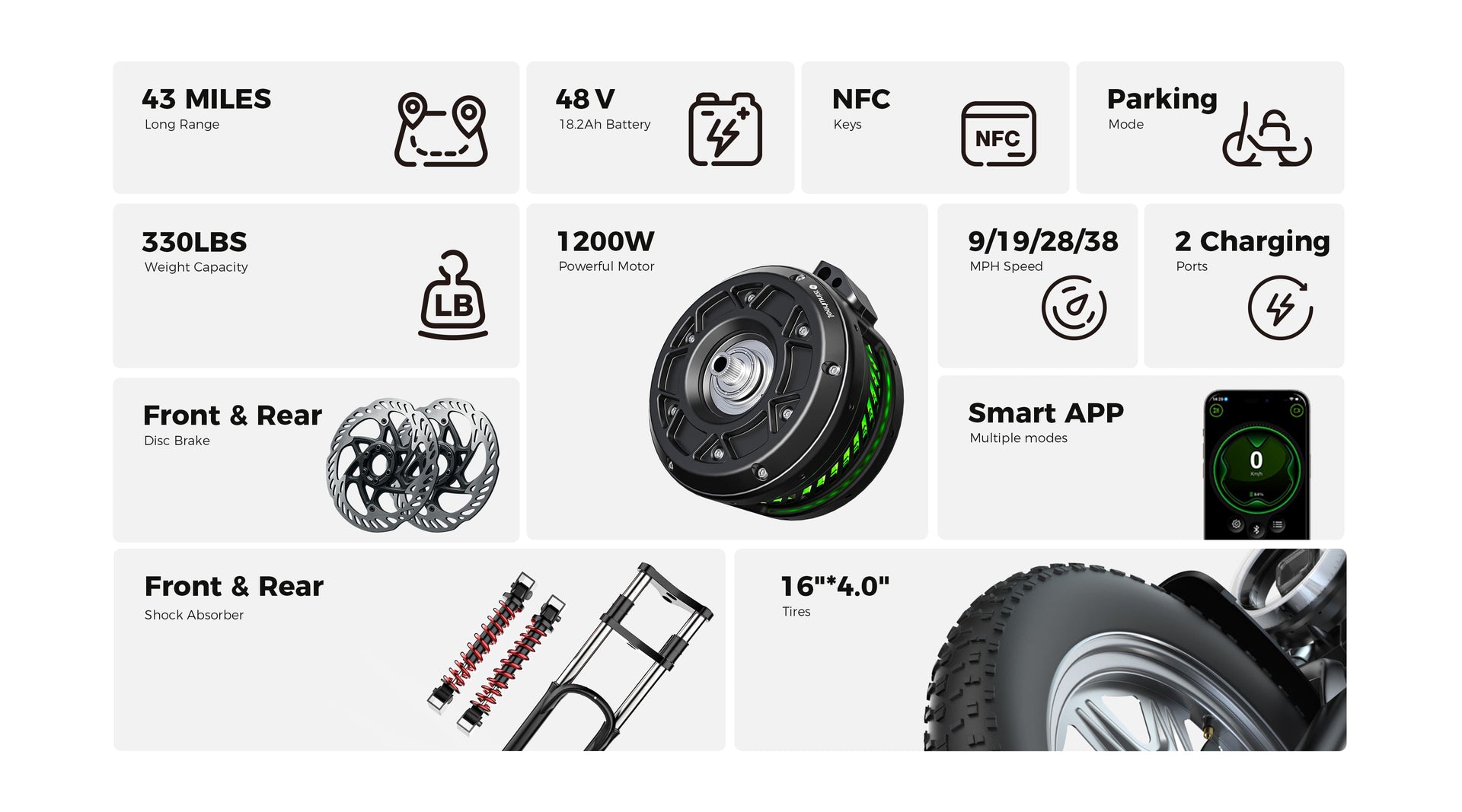 Go the Distance: Up to 43 miles on a single charge, with fast charging to 100% in just 3–4 hours.