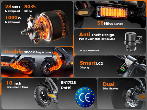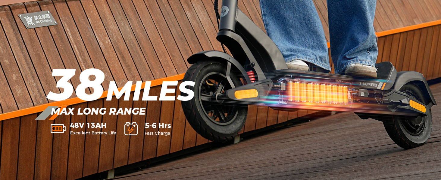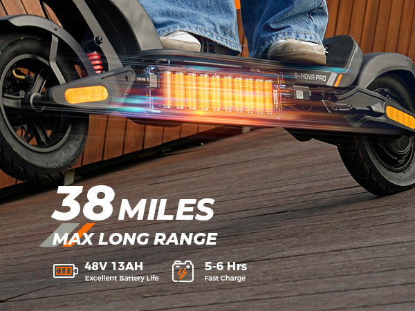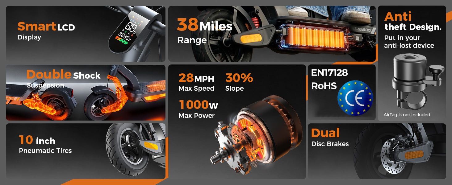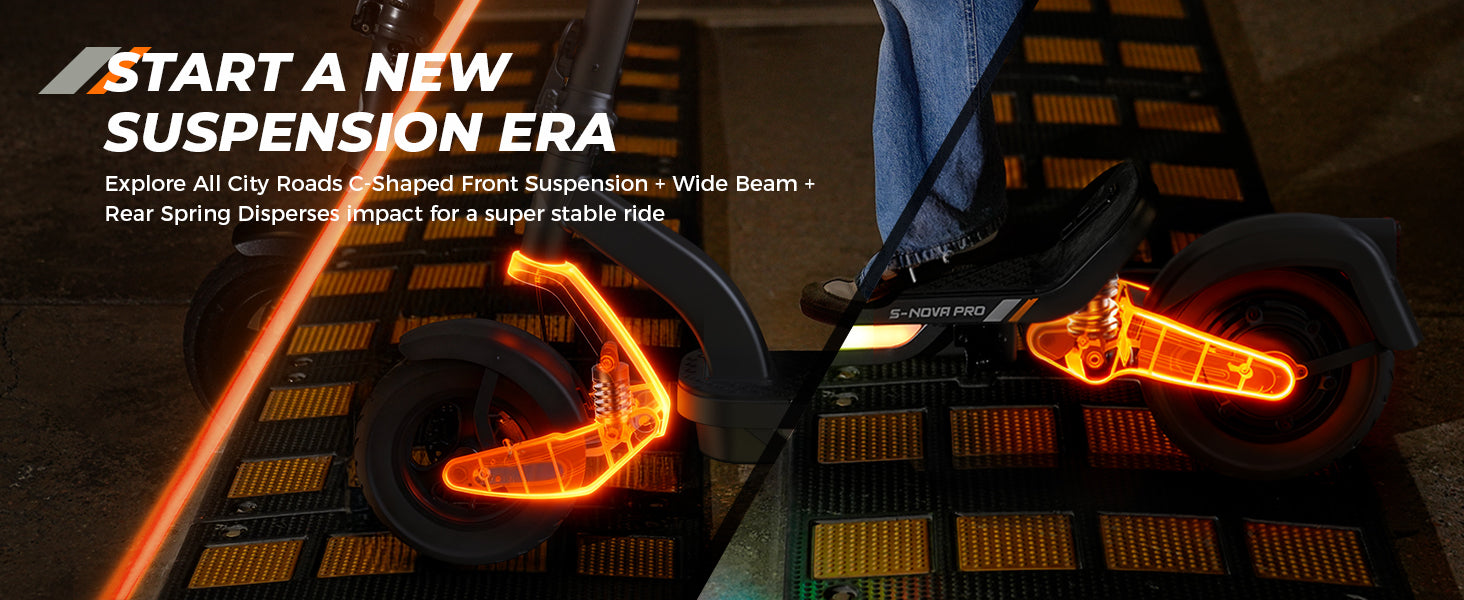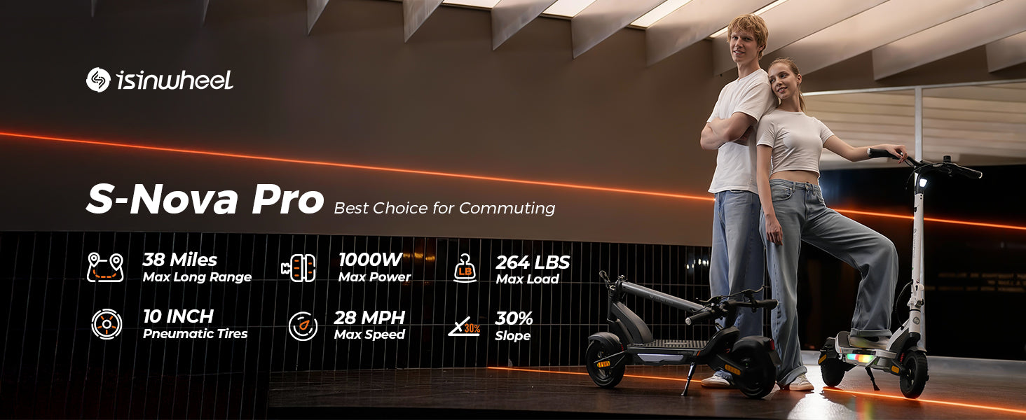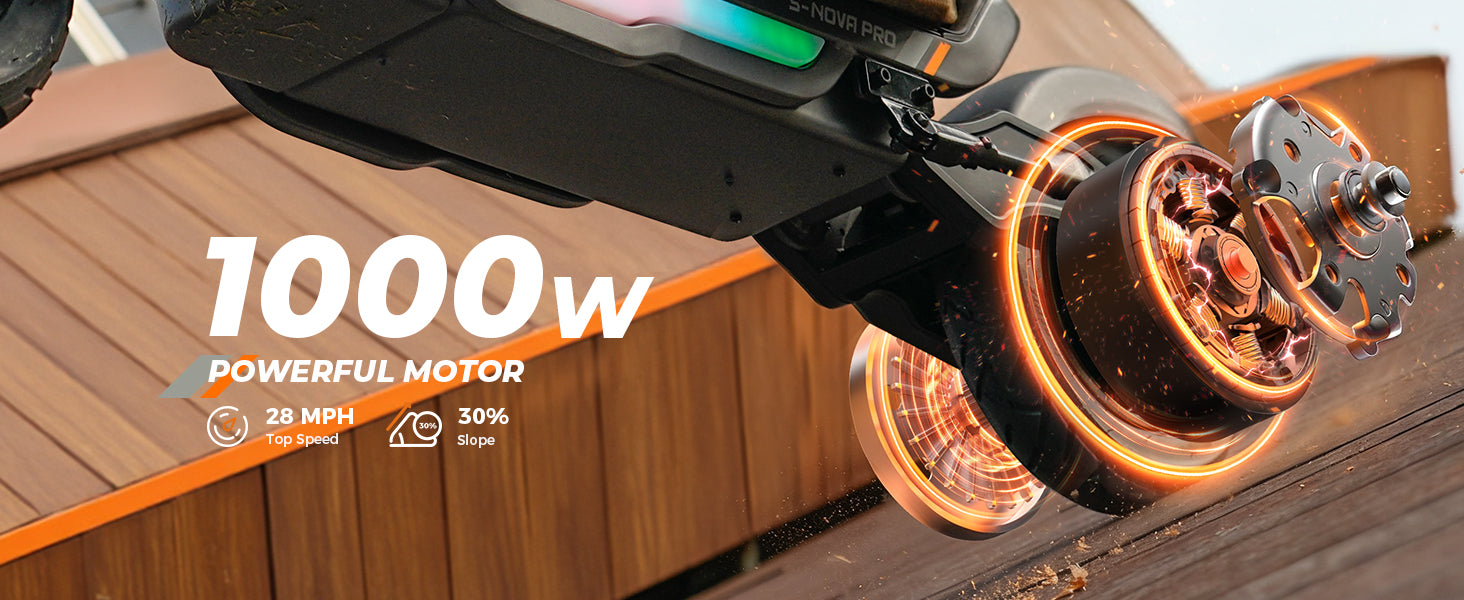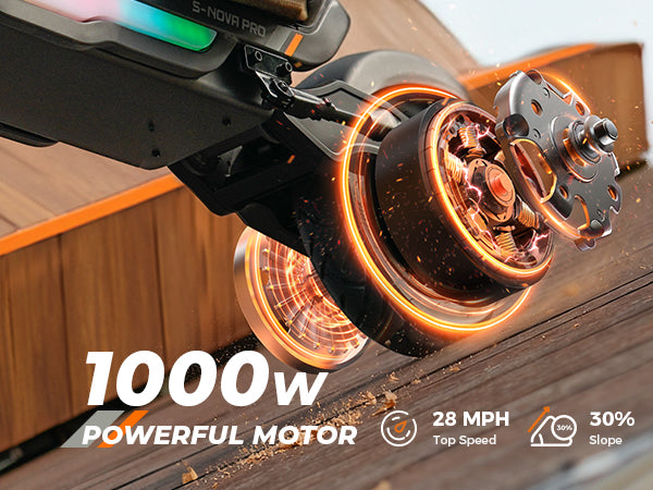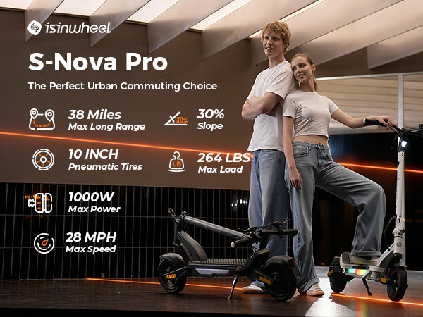 The S Nova Pro is powered by a 1000W Max motor, reaches up to 28 MPH, and delivers 38 miles of range per charge. It features 10-inch pneumatic tires, front and rear swingarm suspension, handlebar turn signals, and full App connectivity, offering a stylish and powerful commuting experience.